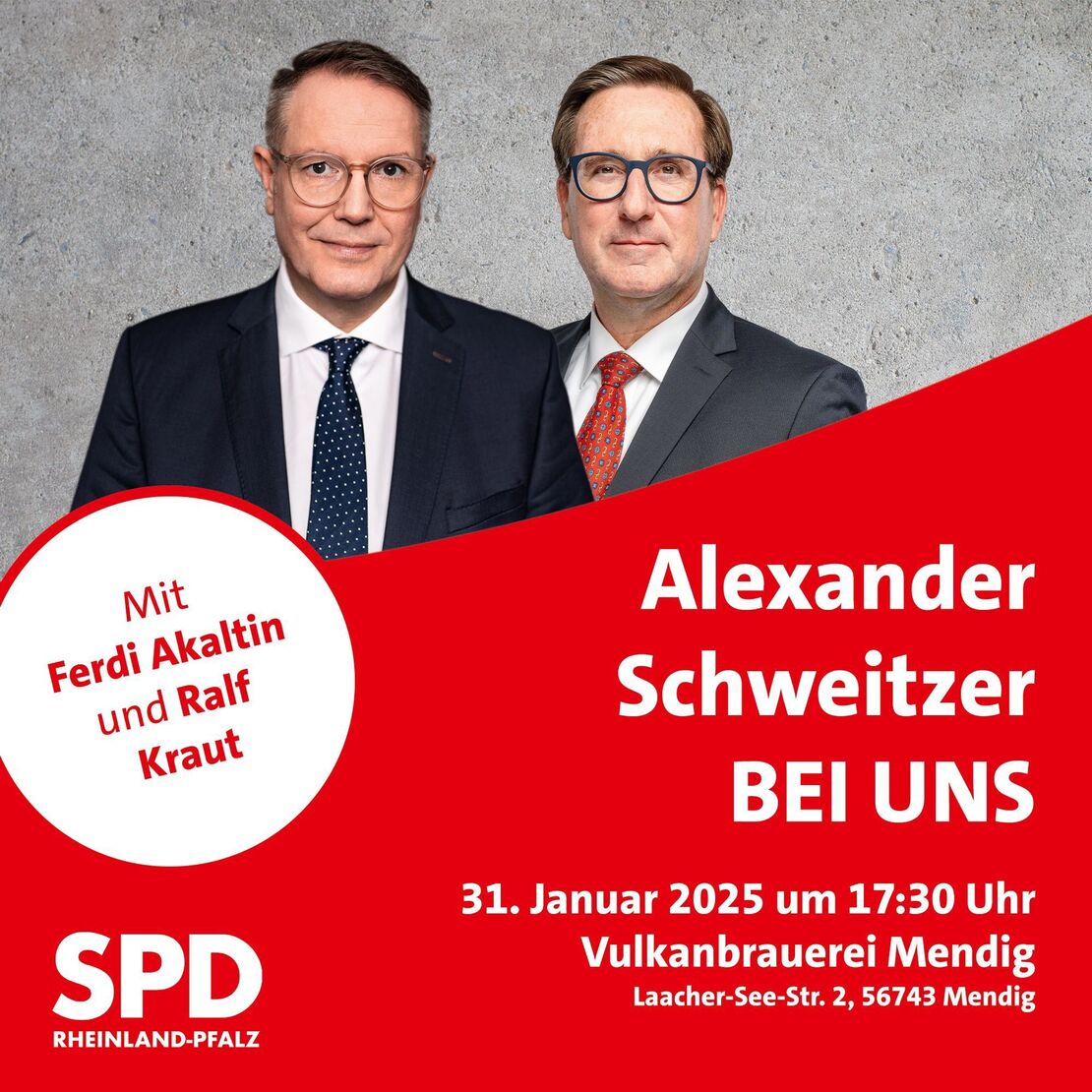 Im Rahmen der Bundestagswahl 2025 lädt die SPD Rheinland-Pfalz zur Dialogtour „Alexander Schweitzer BEI UNS“ ein. Die Veranstaltung findet am 31. Januar 2025 um 17:30 Uhr in der Vulkanbrauerei Mendig, Laacher-See-Straße 2.
