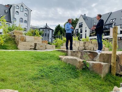 Zwischen zwei Terminen finden Marc Ruland, Generalsekretär der SPD Rheinland-Pfalz sowie SPD-Kreisvorsitzender, und Christoph Schmitt, SPD-Bundestagskandidat, die Zeit, im Historischen Garten nahe des Andernacher Stadtzentrums kurz innezuhalten. „Ein wirklich toller Ort inmitten unserer Essbaren Stadt, der viele Andernacher und Gäste unserer Stadt zum Verweilen einlädt. Der neue Garten führt die Besucher von der römischen in die mittelalterliche Gartenwelt“, erzählt Ruland seinem sozialdemokratischen Mitstreiter.